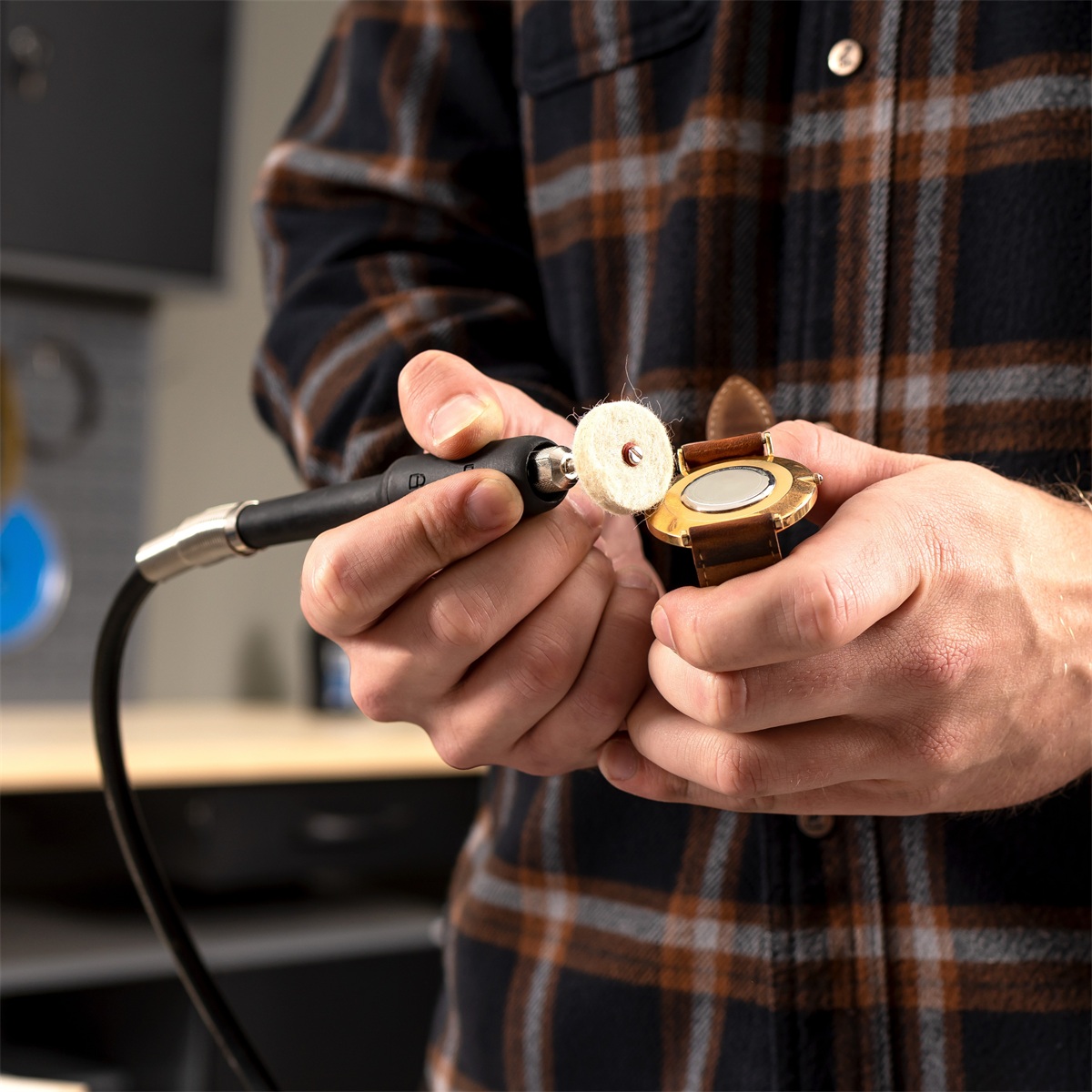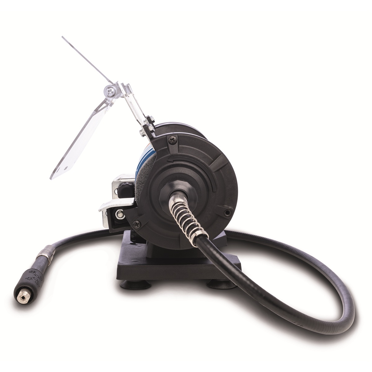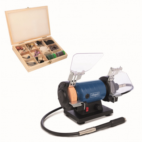 Další možnosti využití přináší flexibilní hřídel o délce 1 m. Díky standardně dodávanému 103 dílnému příslušenství v praktickém dřevěném boxu s ní můžete řezat, brousit nebo leštit mimo brusku samotnou. Stroj můžete přidělat k pracovní desce napevno nebo využít neklouzavé přísavné gumové nožičky.