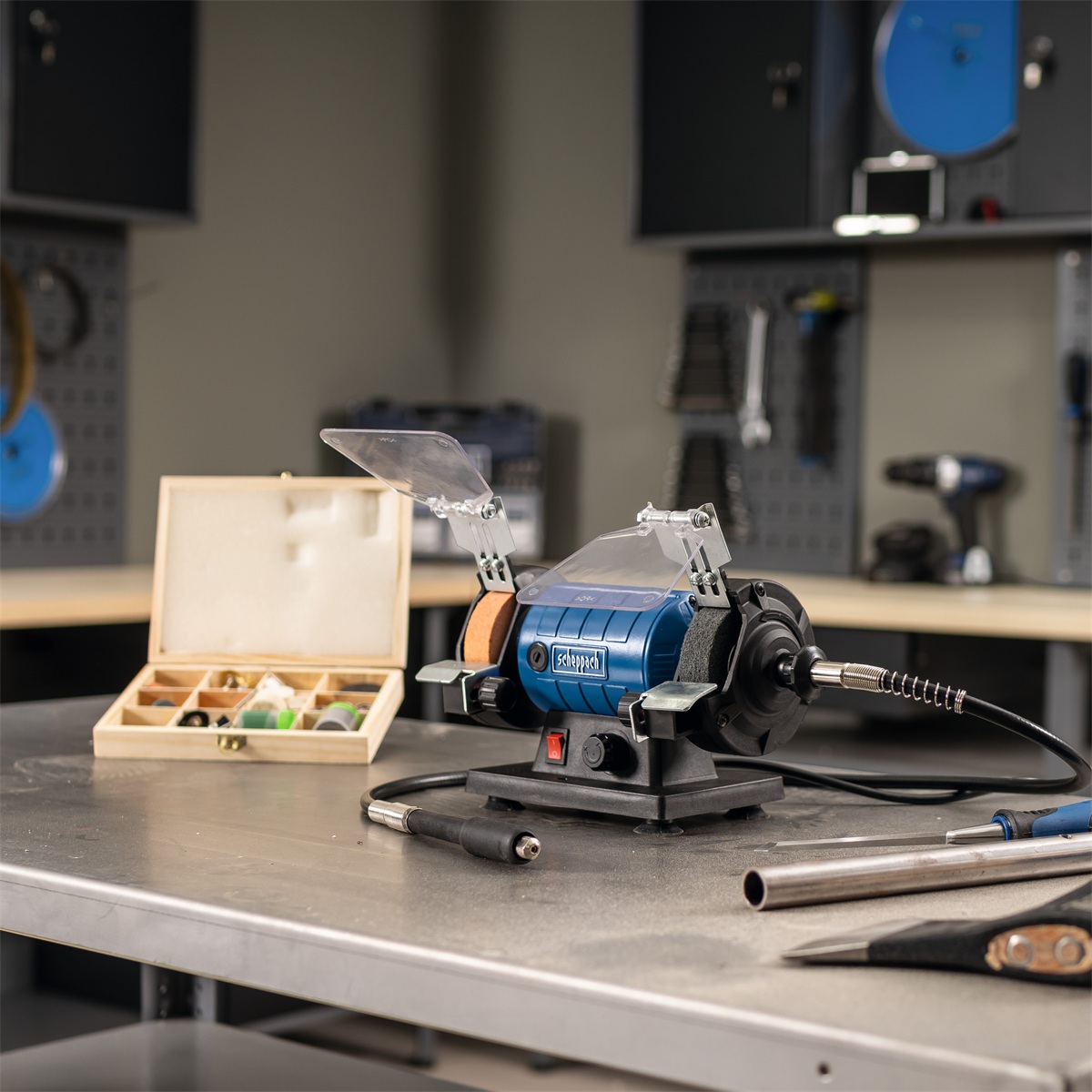 Základem je jeden brusný kotouč o zrnitosti 120 a jeden leštící kotouč o zrnitosti 400. Obě pracoviště jsou vybavena transparentní ochranou očí proti odlétávajícím zbytkům a opěrnou částí pro opracovávaný obrobek. Poctivé tělo brusky, antivibrační uložení a nastavitelná rychlost otáček od 0 do 11000 ot./min. jsou zárukou profesionálních výsledků.