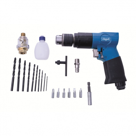 příslušenství: 10 x HSS vrták, 6 x CrV bit, 1 x držák bitů, maznička, olej, sklíčidlo, konektor pro rychlospojku, olejový přimazávač vzduchu