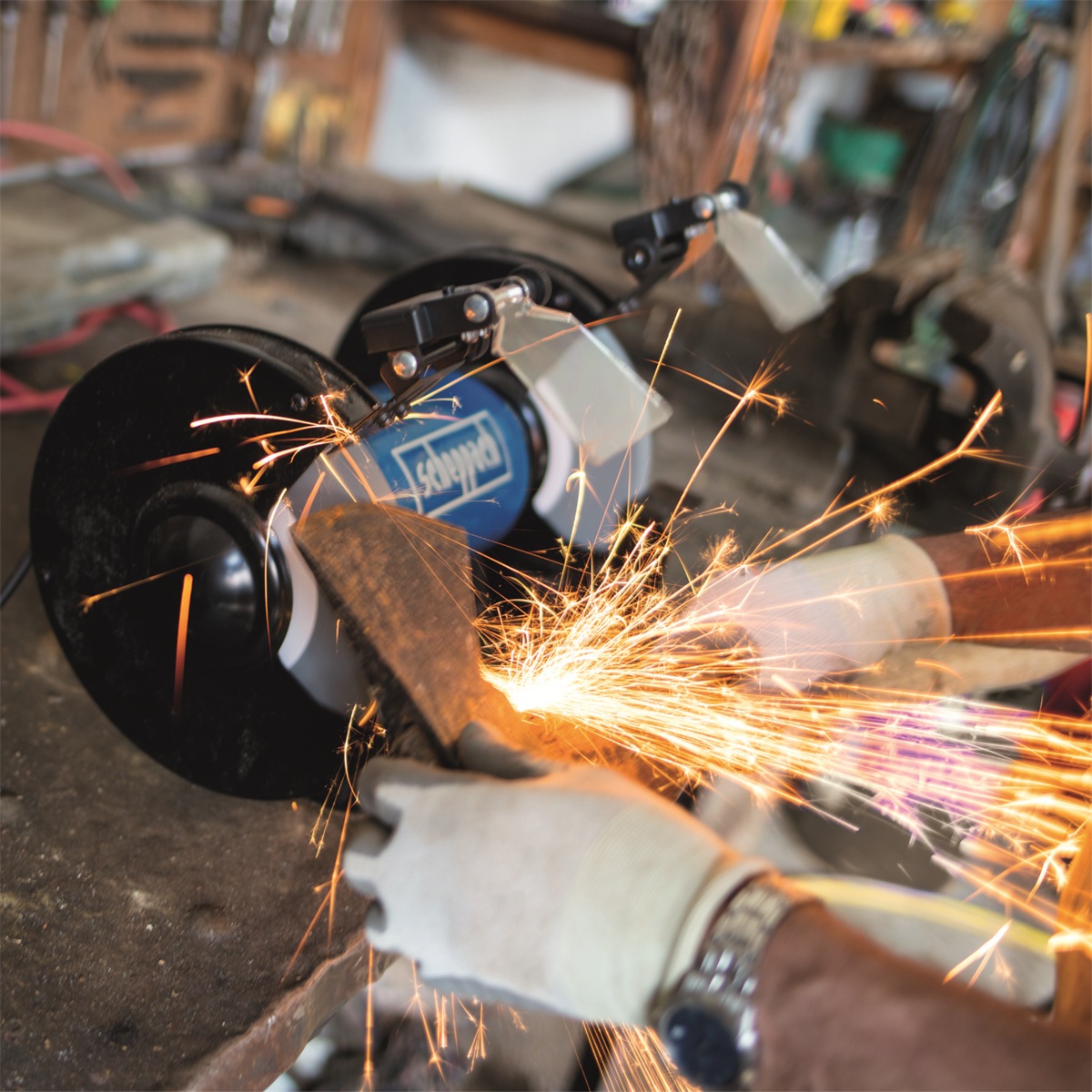 Pro stabilitu a pohodlí při práci je bruska osazena litinovým podstavcem s možností pevného ukotvení, dále gumovými nožičkami, které tlumí vibrace. Samozřejmostí jsou ochranné kryty proti odlétajícím částem obrobku, nastavitelné opěrky prodlužující životnost kotoučů a také moderní LED osvětlení nad každým kotoučem, které zajišťuje perfektní viditelnost i při detailní práci.