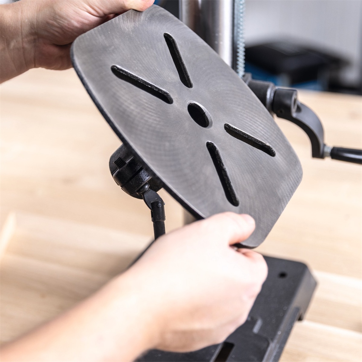 Silný 750W indukční motor poskytuje dostatek výkonu i pro náročnější úkoly a zajišťuje plynulý chod bez vibrací. Masivní litinová konstrukce se sloupem o průměru 65 mm zajišťuje vysokou stabilitu, zatímco velký pracovní stůl 240 × 240 mm nabízí dostatek prostoru i pro větší obrobky. Stůl lze otáčet o 360°, plynule výškově nastavovat a naklápět až o ±45°, což výrazně zvyšuje variabilitu práce.