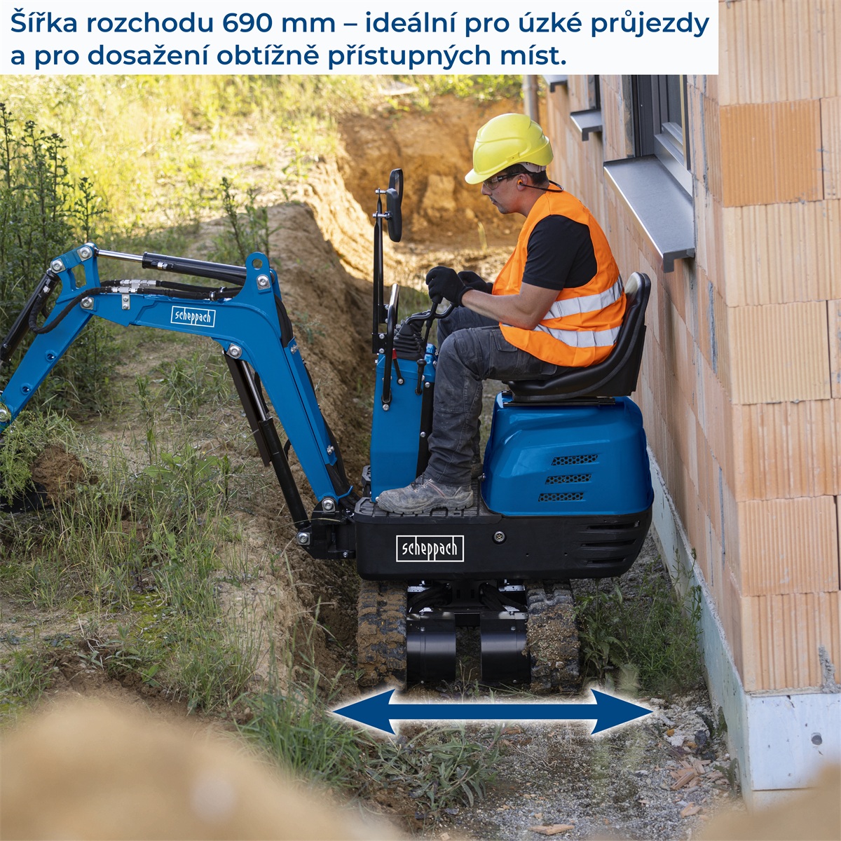 EXC 815 Tento kompaktní mini bagr s provozní hmotností 563,5 kg a schopností mimoosého kopání je ideálním pomocníkem pro širokou škálu výkopových prací, údržbě zahrad, vyrovnávání půdy, nakládání a vykládání materiálů na vozidlo apod. Skvěle se hodí na malá nebo jinak těžko přístupná místa. Díky své štíhlé konstrukci s rozchodem pásů pouhých 690 mm se snadno dostane i do úzkých průchodů a stísněných prostor. Rypadlo je vybaveno výkonným čtyřtaktním benzínovým motorem s výkonem 8,5 HP a objemem 306 cm3, který poskytuje dostatečnou sílu i pro náročnější úkoly. S rychlostí otáčení 9,3 ot./min a plným rozsahem otáčení 360° zajistí maximální flexibilitu při práci. Jeho výkonná hydraulika nabízí rozrývací sílu na rameni 4,2 kN a 8,8 kN na lžíci. Pracovní parametry zahrnují maximální hloubku výkopu 1 200 mm, dosah 2 330 mm, výšku nakládání až 1 350 mm a výšku vysypání až 2 100 mm. Rameno lze natočit v úhlu +/- 70°, což umožňuje precizní práci i v úzkých prostorech. Standardně je vybaveno 290 mm širokou lžící s objemem 0,011 m3, která je vhodná pro menší zemní práce. Minibagr je vybaven robustním gumovým pásovým pohonem s šířkou 150 mm, který lze ovládat nezávisle. Pohon umožňuje maximální rychlost 1,7 km/h a stoupavost do 15°. Součástí je také velká nivelační radlice, kterou lze snížit pro stabilizaci ramene nebo k přesunu zeminy. Snadné startování zajišťuje elektrický startér a bezpečnost, mimo jiné, parkovací brzda s hydraulickým zámkem. O dobrou viditelnost ve zhoršených světelných podmínkách se stará výkonné LED osvětlení integrované do ramene stroje.