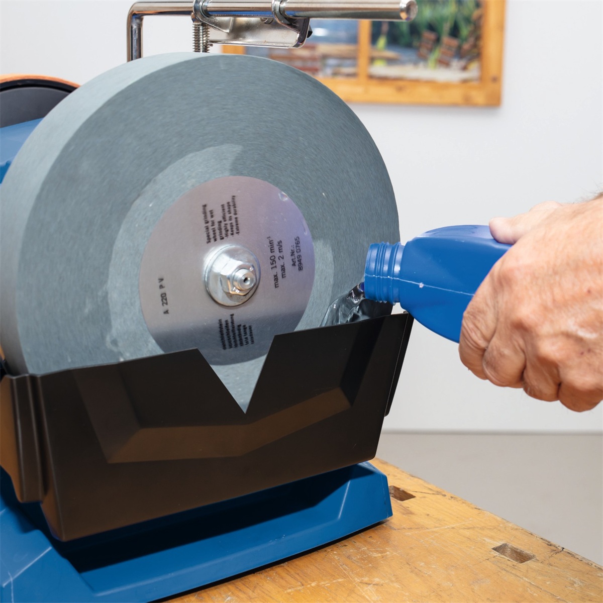 Základem kvalitního ostří je široký brusný kámen o průměru 200 mm s mikročásticemi oxidu hlinitého, díky kterým lze brousit i nástroje z tvrdokovu. Pro finální úpravu a zahlazení mikrootřepů slouží vyměnitelný honovací kožený kotouč.
